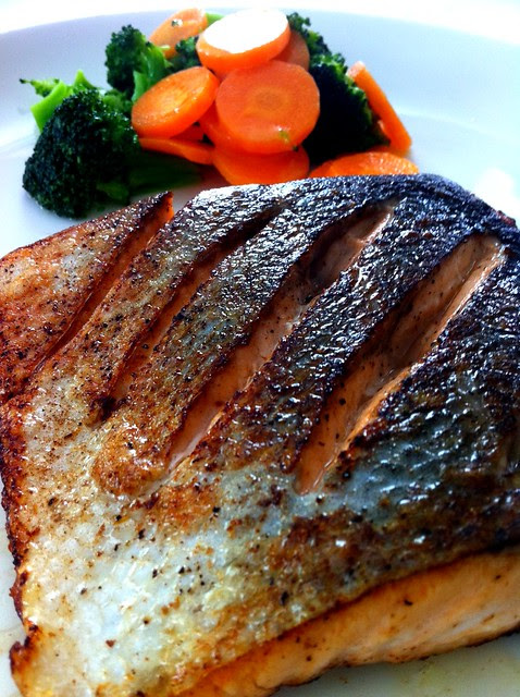 (5) Put the skin side of the salmon on to the pan (skin facing pan)